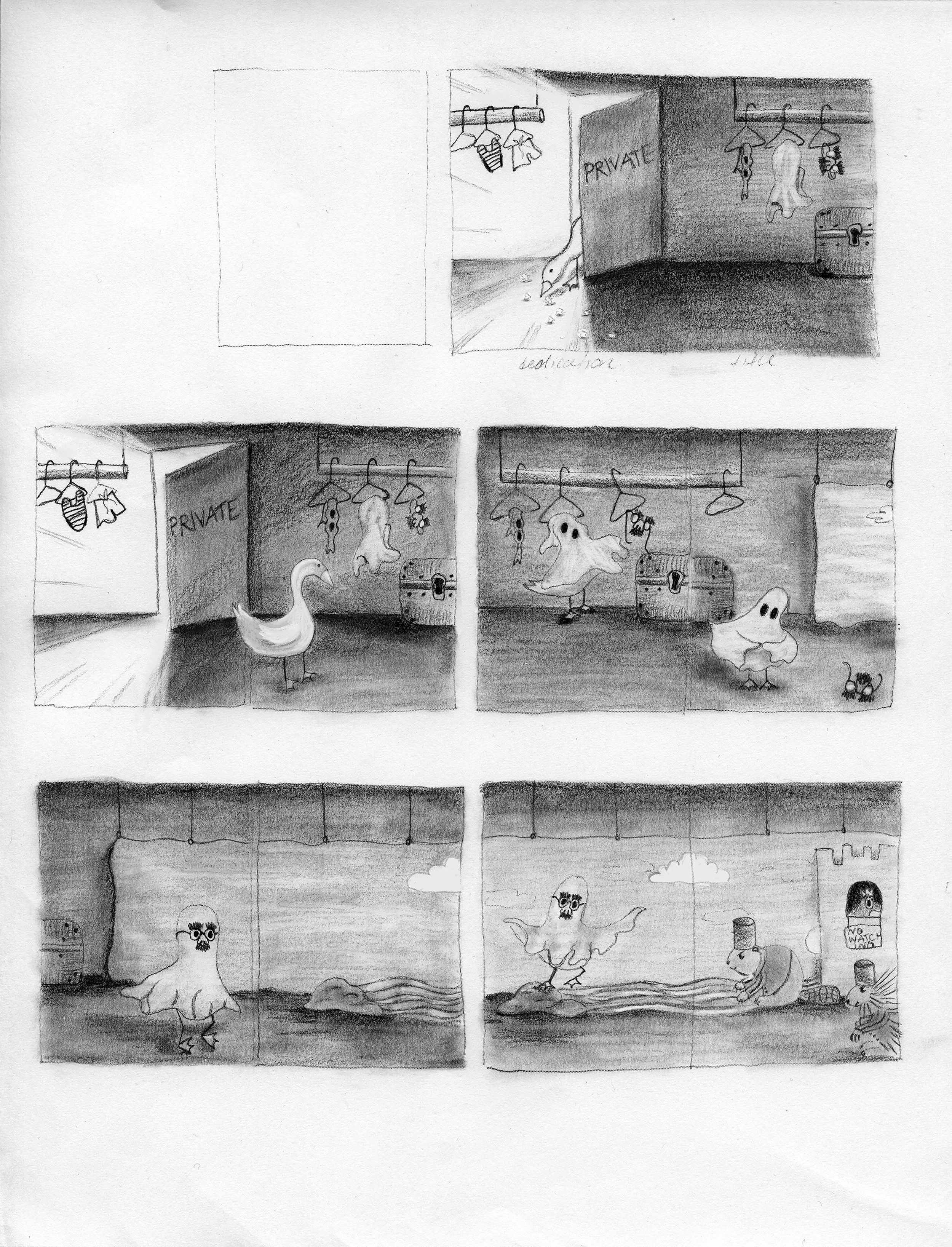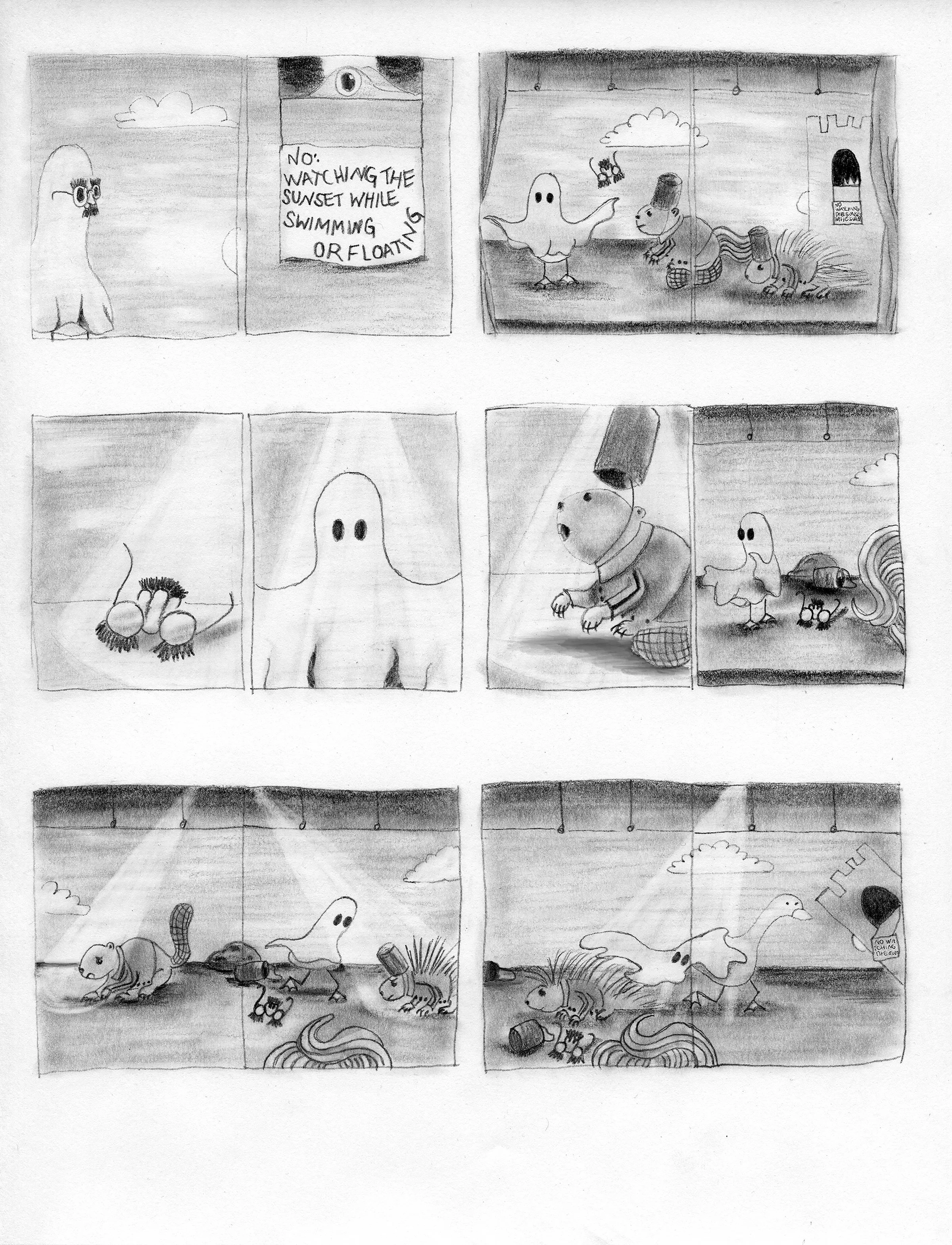 A goose goes shopping for a bathing suit before an evening swim, only to find himself breaking the rules, and making a scene.